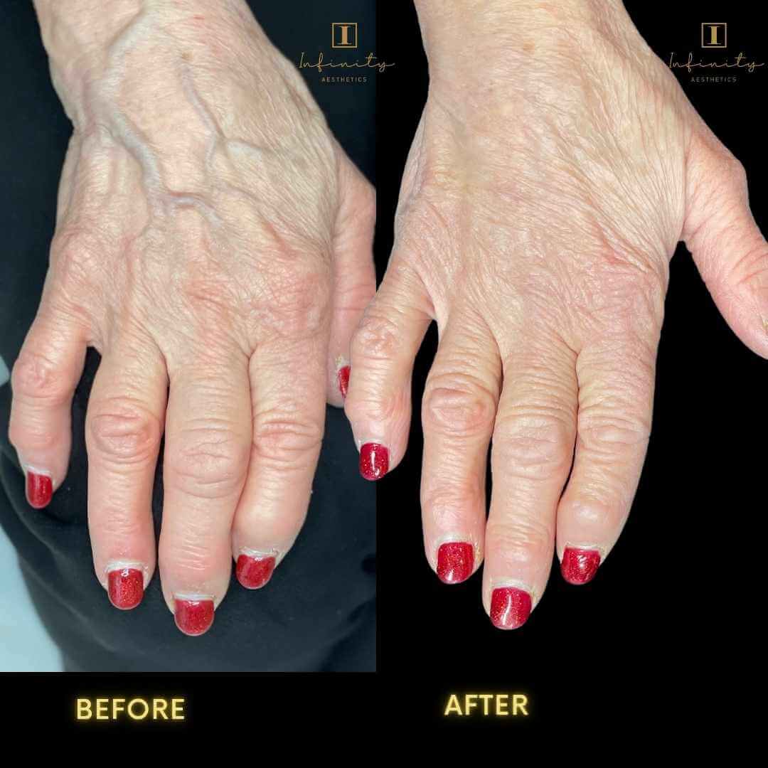 There are various ways to treat the signs of ageing, including targeted injection of dermal filler (Radiesse®) into the back of the hand with local anaesthetic to minimise any discomfort leading to a rejuvenated appearance.